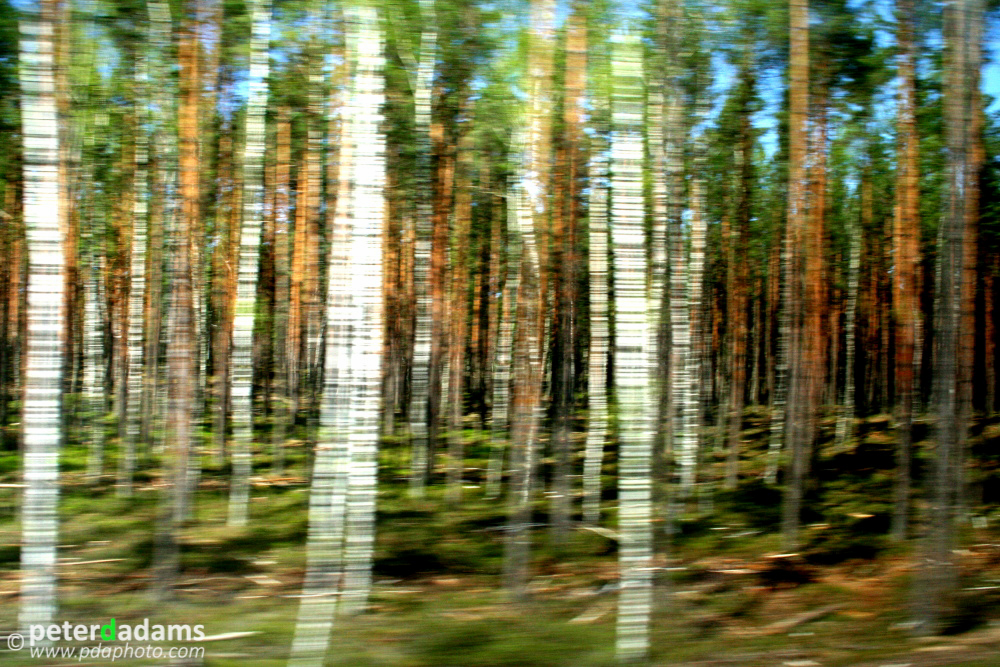 A warm sunny previous week had allowed the greenery to flourish, sprouting everywhere, awoken from the long winter slumber by the mild spring days and long daylight. This is the primary reason why there is so much colour and vibrancy to the image; the red-tan trunks of the Scots Pine, backdropped upon an effervescent green forest floor, pale blue skies, and shining silver birch all lit up by the warm low sunlight. Shadows add depth to the image, whilst the slow shutter creates the movement to make the image abstract; to make a very normal forest picture into something very different, not unlike when we let our gaze rest on a far off point when the foreground is moving past us rapidly.